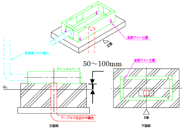 基礎(充電器本体の下部のコンクリート) 急速充電器は強固な基礎にアンカーボルトで固定しなくてはなりません。埋設ケーブル配線用の配管も事前施工する必要がございます。