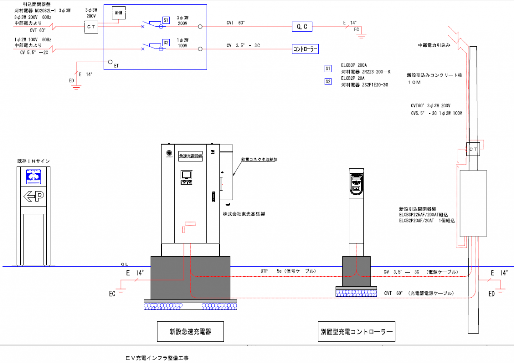 急速充電器が高出力120kW以上の三相400Vの施工ですと必要になります。